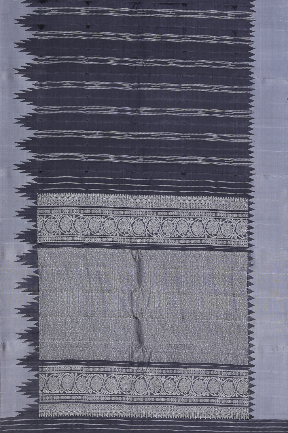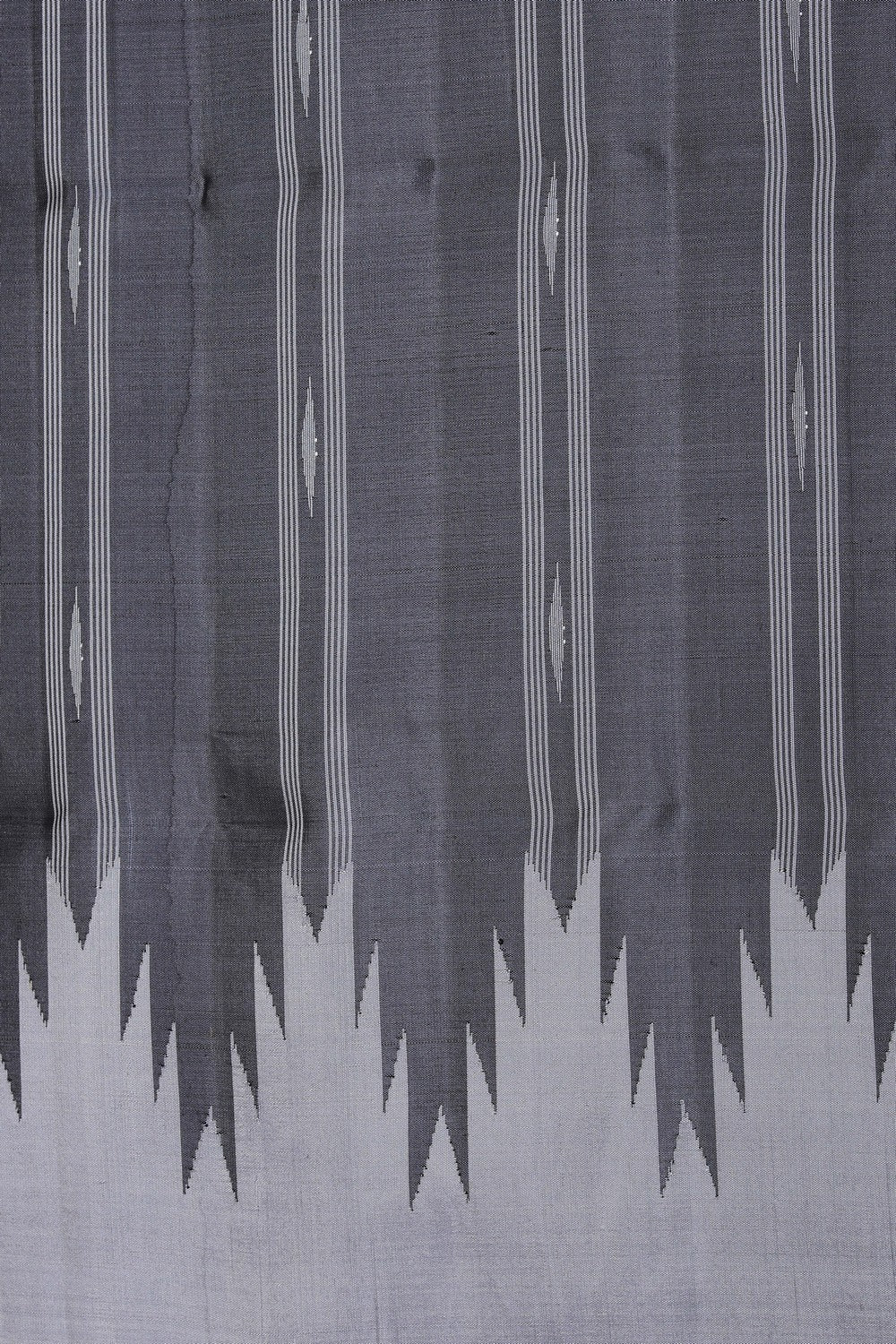 Simple yet elegant Gadwal silk grey saree. The border is adorned with a plain temple series on either side and pallu enhanced with thread-woven diamond motifs adjacent to the floral vine.